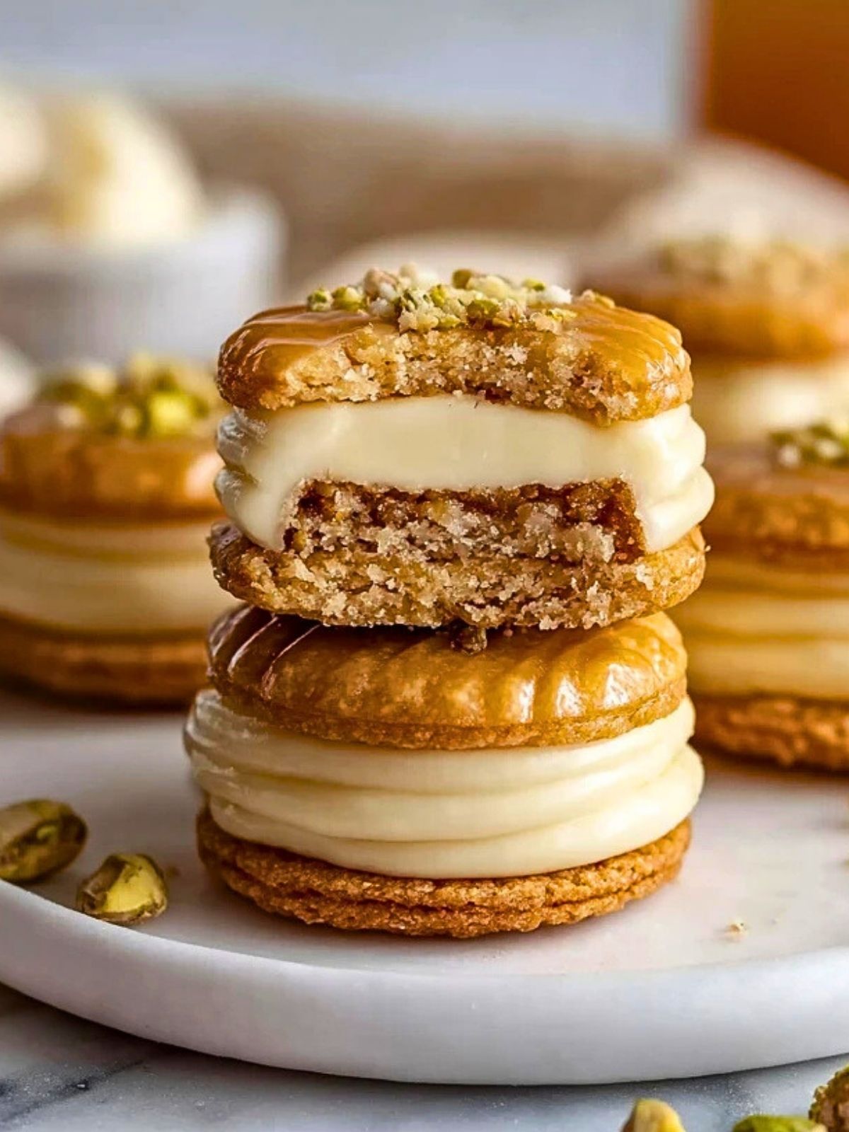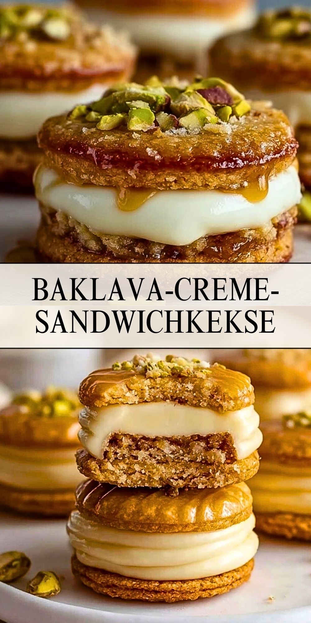 Diese Baklava-Creme-Sandwichkekse verbinden den unwiderstehlichen Geschmack von klassischem Baklava mit der cremigen Fülle eines Desserts. Der buttrige Keksboden, gefüllt mit einer samtigen Vanillecreme, wird von einer goldenen Honigschicht und knackigen Pistazien gekrönt. Ein Bissen reicht und man fühlt sich sofort in einen orientalischen Süßwarenladen versetzt!