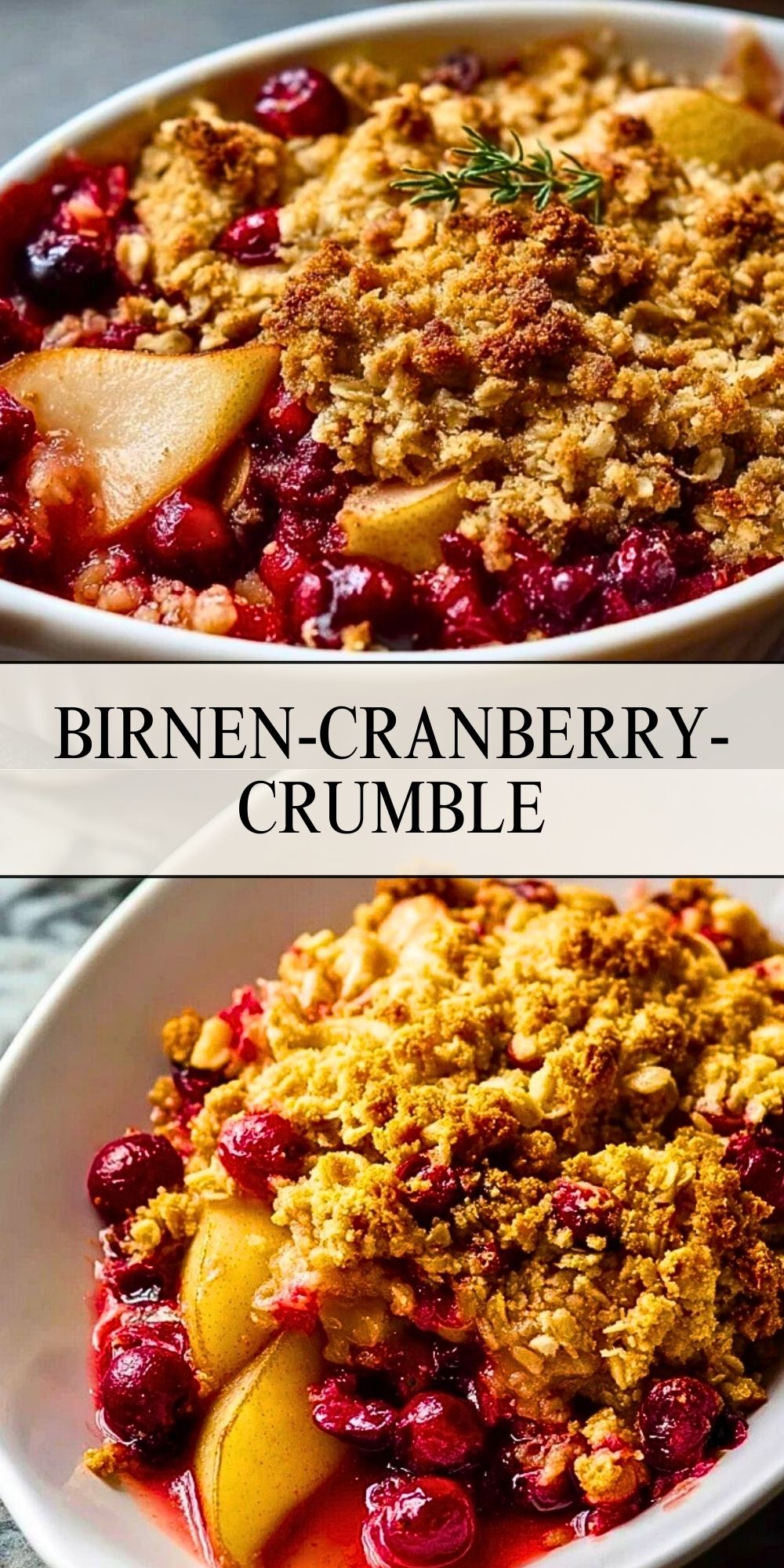 Ein herbstlich-winterlicher Birnen-Cranberry-Crumble mit knusprigen Haferflocken-Streuseln, fruchtigen Birnen und einer herrlich herben Cranberry-Note. Perfekt als Dessert oder süßes Frühstück – warm serviert mit Vanilleeis ein echter Genuss!