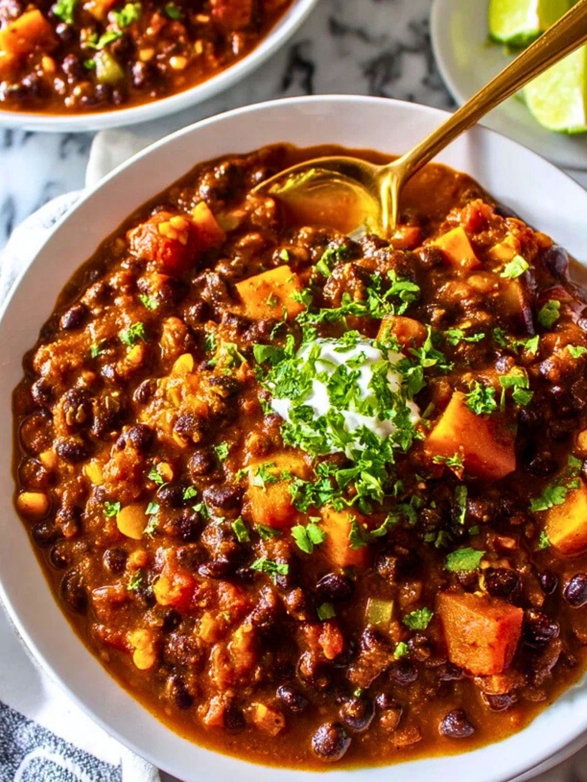 Ein wärmendes, pflanzliches Chili mit schwarzen Bohnen, Süßkartoffel und Paprika – perfekt für ein herzhaftes, gesundes und schnelles Abendessen.