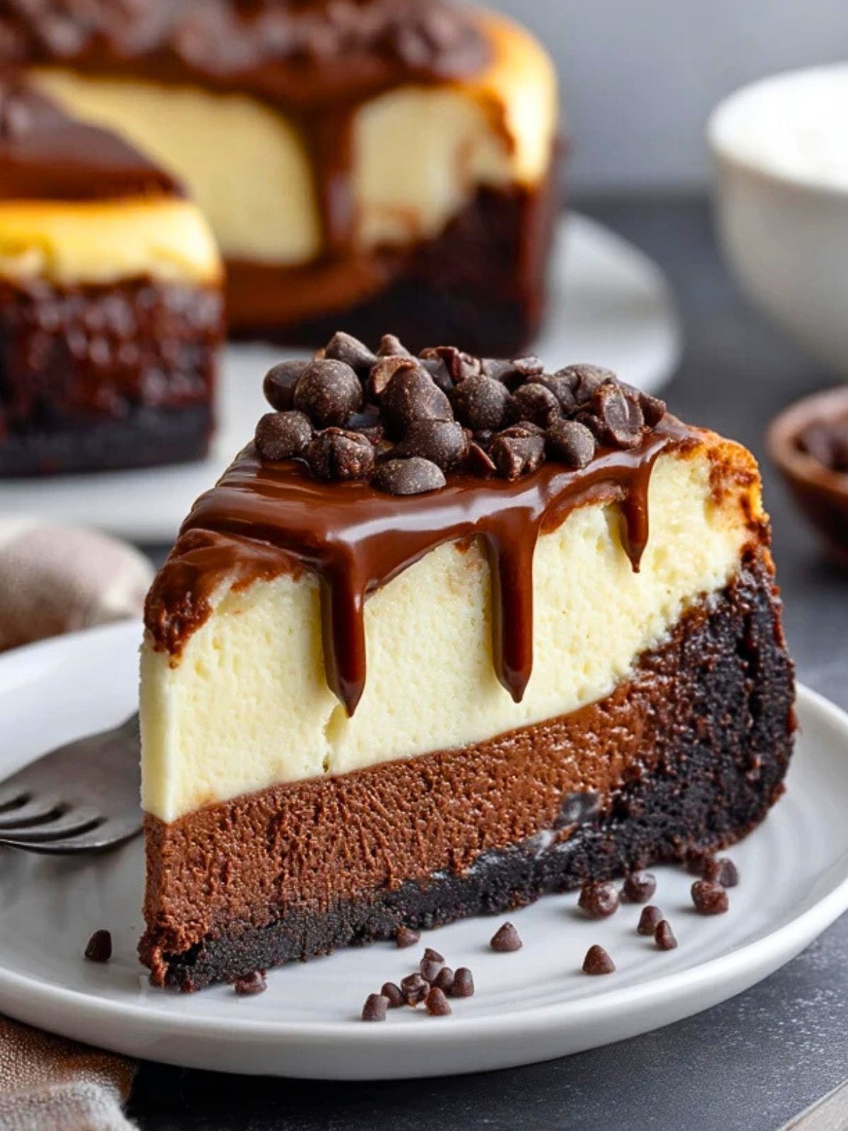 Das Geheimnis liegt in der Reihenfolge und den Backzeiten: Erst wird der Brownie-Boden leicht vorgebacken, damit er saftig bleibt, aber nicht zu sehr durchweicht. Anschließend kommt die cremige Käsekuchenmasse darauf, die langsam stocken darf. Zum Abschluss sorgt eine glänzende Schokoladenglasur für den Wow-Effekt. Wichtig: Lass den Kuchen komplett auskühlen, bevor du die Glasur aufträgst, damit sie nicht verläuft.