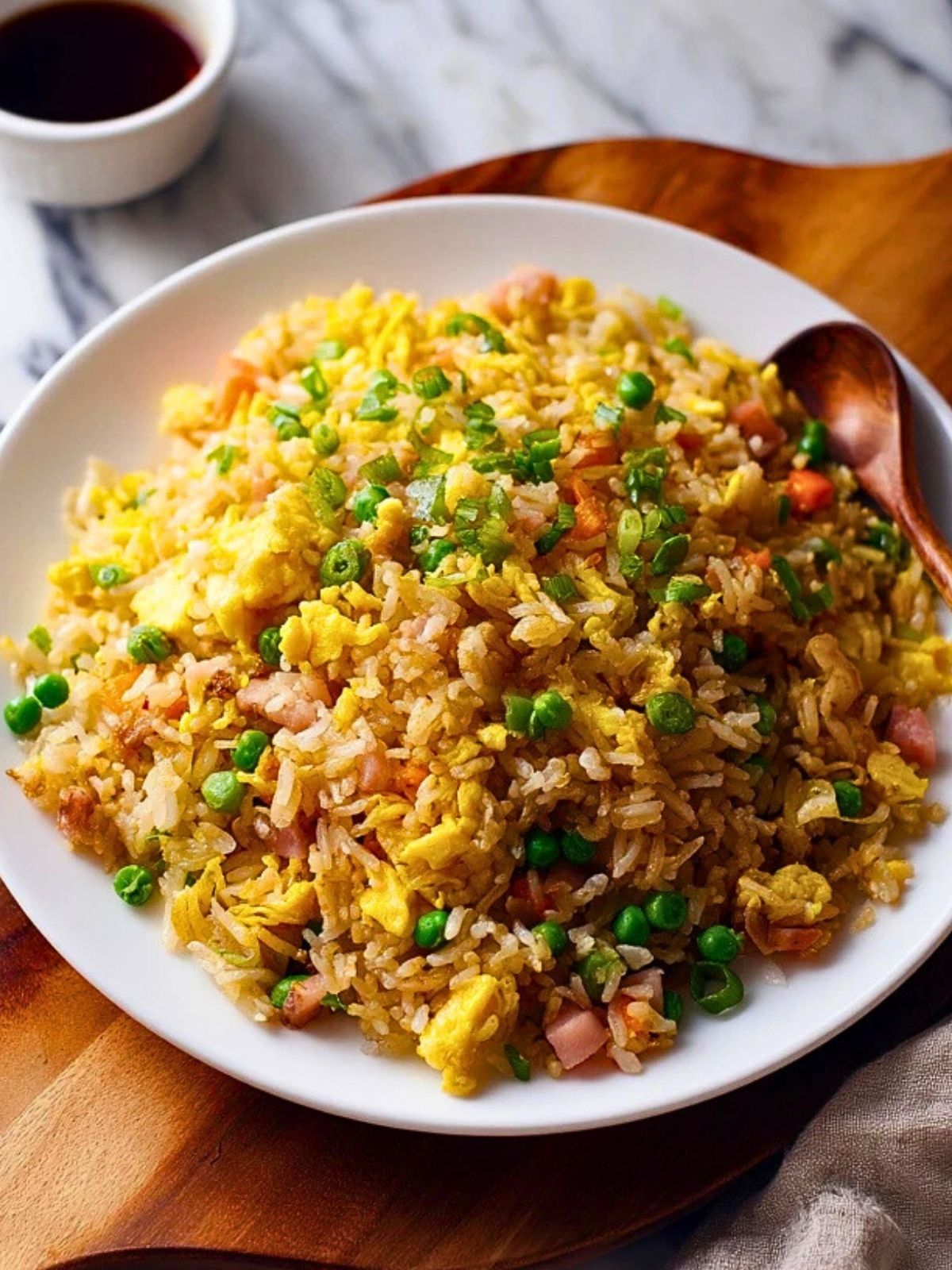 Gebratenen Reis mit Ei direkt heiß servieren – am besten mit etwas zusätzlicher Sojasauce nach Geschmack.
