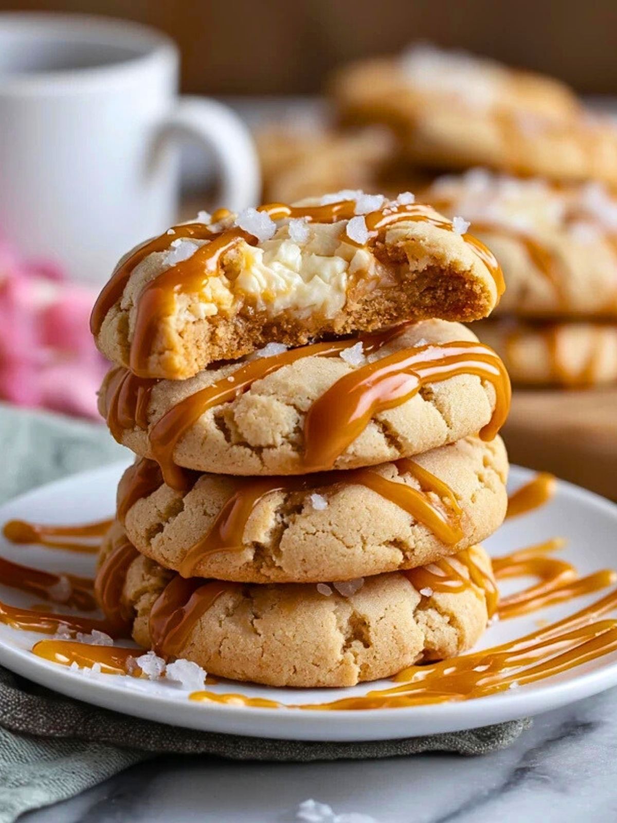 Die Karamell-Käsekuchen-Plätzchen schmecken am besten frisch und leicht gekühlt, damit die Füllung schön cremig bleibt. Im Kühlschrank aufbewahrt, halten sie sich luftdicht verpackt etwa 3–4 Tage. Für einen noch intensiveren Geschmack die Plätzchen vor dem Servieren kurz auf Raumtemperatur bringen.