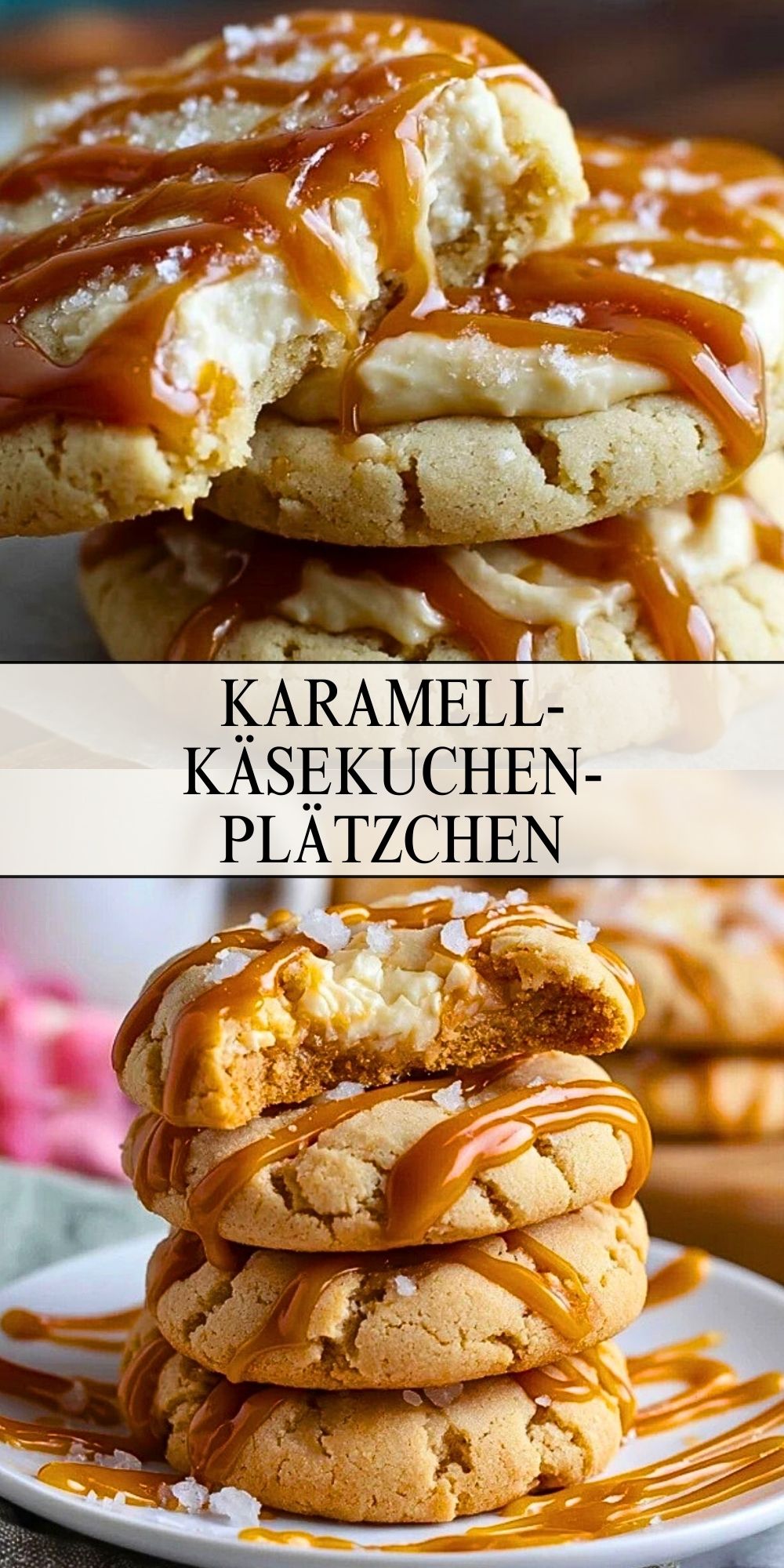 Diese Karamell-Käsekuchen-Plätzchen sind ein wahrgewordener Dessert-Traum: Zart-weiche Cookies mit einem cremigen Käsekuchen-Kern und großzügigem Karamell-Topping. Die Kombination aus buttrigem Mürbeteig, frischer Frischkäsefüllung und süß-salzigem Karamell macht sie zum Highlight jeder Kaffeetafel oder als besonderes Mitbringsel.