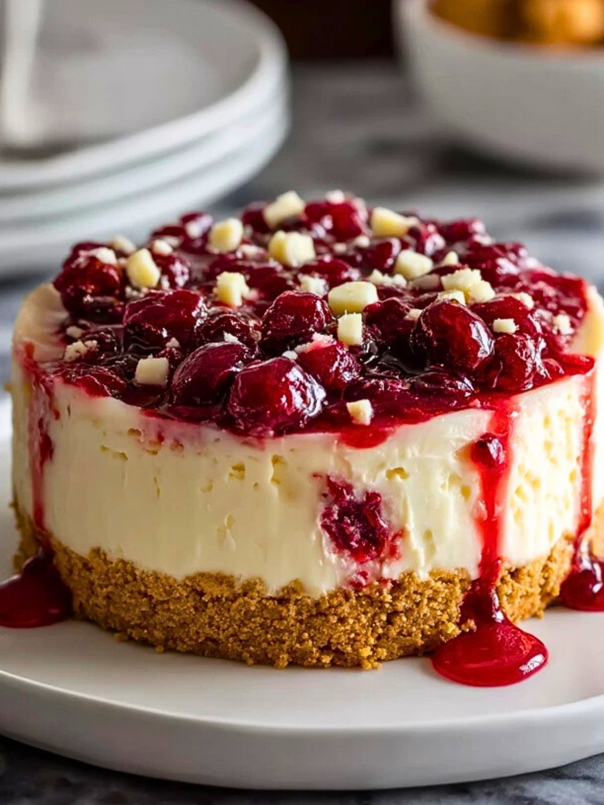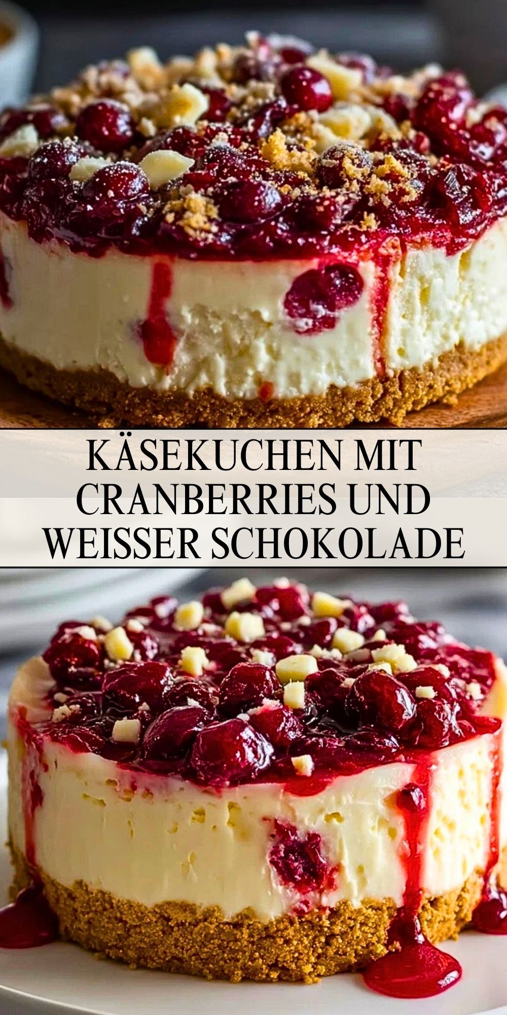 Ein besonders cremiger Käsekuchen mit weißer Schokolade und fruchtigem Cranberry-Kompott auf einem knusprigen Keksboden. Perfekt für Wintertage und jeden besonderen Anlass!
