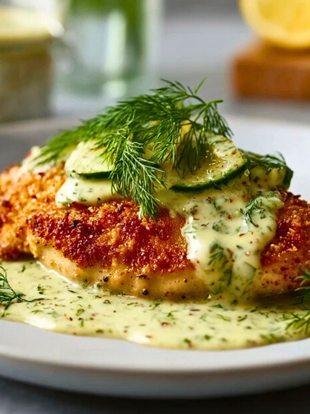 Knuspriges Hähnchen mit Dill-Gurken-Parmesan-Sauce bringt frischen Wind in deine Alltagsküche: Zartes Hähnchenfilet wird goldbraun ausgebacken und mit einer cremigen, pikanten Sauce serviert, in der frischer Dill, knackige Gewürzgurken und herzhafter Parmesan miteinander verschmelzen. Dieses Gericht verbindet klassische Hausmannskost mit überraschenden Aromen und eignet sich perfekt, wenn du Gäste beeindrucken oder deine Familie verwöhnen möchtest.