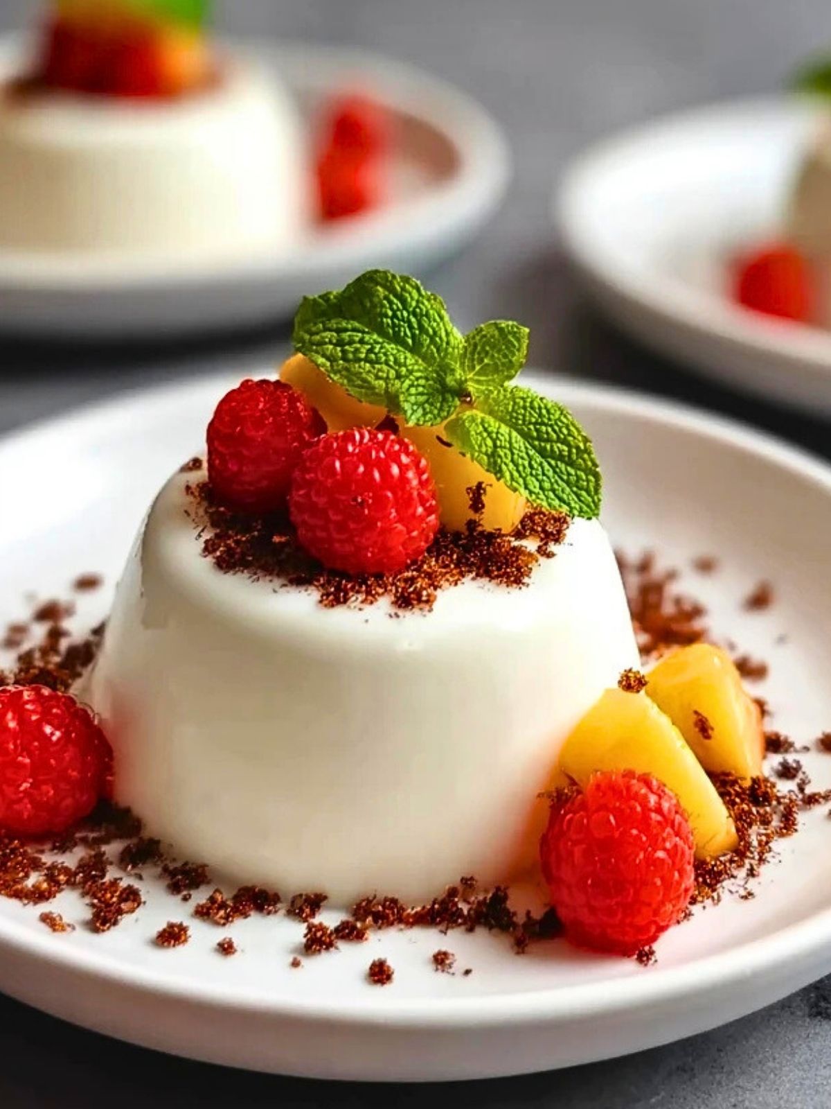 Panna Cotta vorsichtig aus den Förmchen lösen oder direkt im Glas servieren. Mit gewürfelter Mango, Kiwi, Schokoladen-Crunch und frischer Minze garnieren.