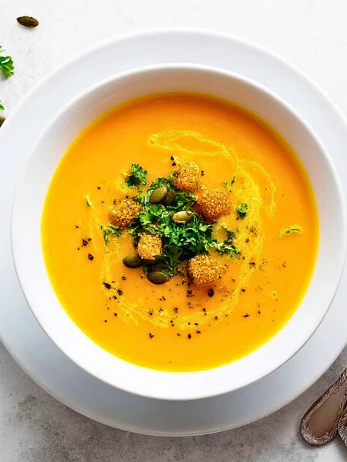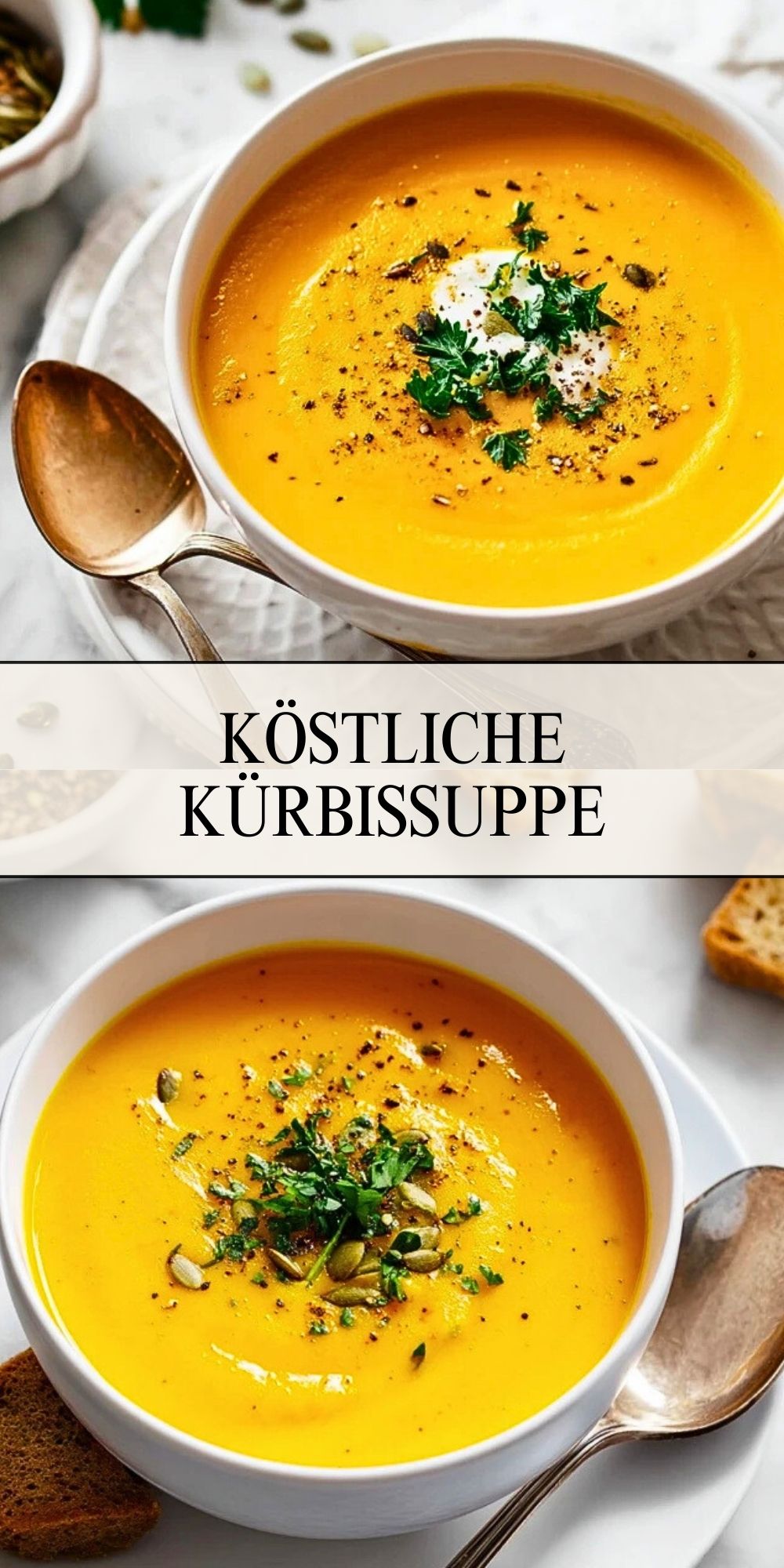 Diese köstliche Kürbissuppe vereint samtige Cremigkeit mit aromatischem Kürbisgeschmack. Perfekt für gemütliche Herbstabende, einfach vorzubereiten, wunderbar wandelbar und lässt sich nach Belieben verfeinern.