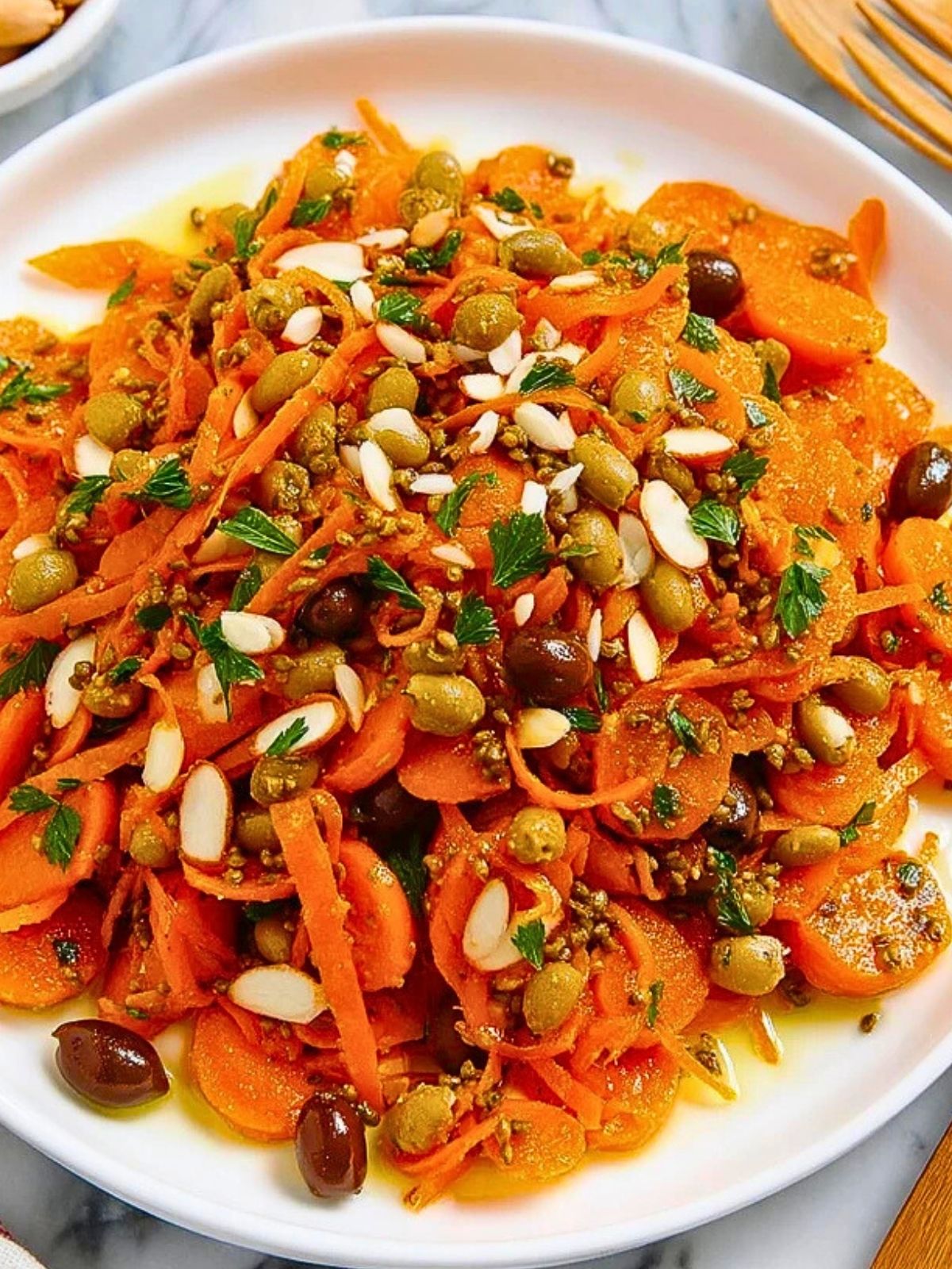 Die Kombination aus süßlichen Karotten, aromatischen Kräutern, würzigen Linsen und nussigen Mandeln sorgt für ein spannendes Geschmackserlebnis. Mit einem Spritzer Zitronensaft und frischer Petersilie serviert, ist dieser Salat nicht nur optisch ein Genuss, sondern überzeugt auch geschmacklich auf ganzer Linie.