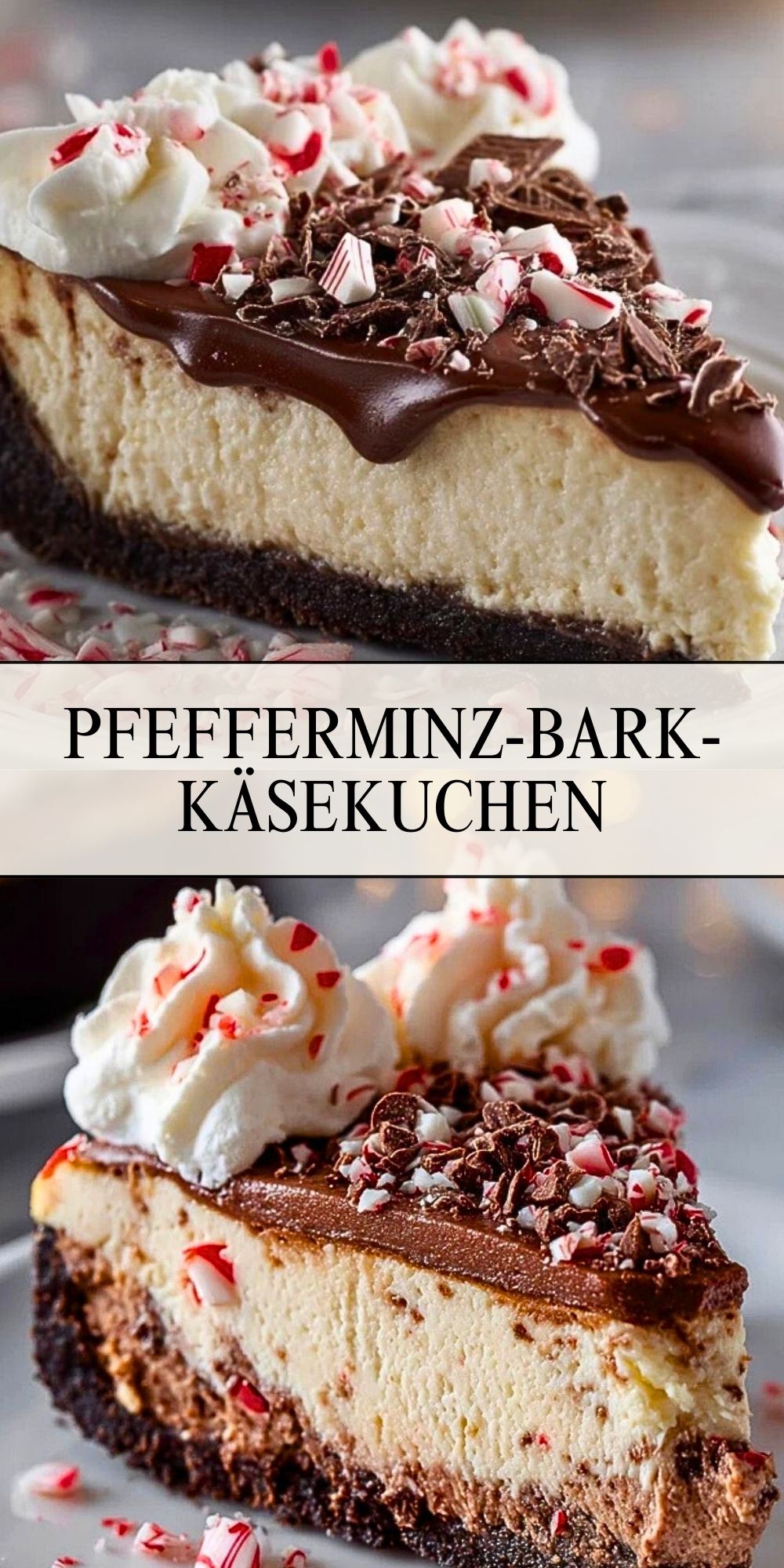 Ein winterlicher Traum aus Schokolade, knusprigen Keksboden und erfrischender Pfefferminznote – der Pfefferminz-Bark-Käsekuchen ist das perfekte Dessert für die festliche Saison. Schon beim ersten Bissen verbinden sich cremige Käsekuchenmasse, knackiger Schoko-Boden und die zartschmelzende Schokoladenglasur mit knusprigen Pfefferminzstückchen zu einem echten Geschmackserlebnis.
