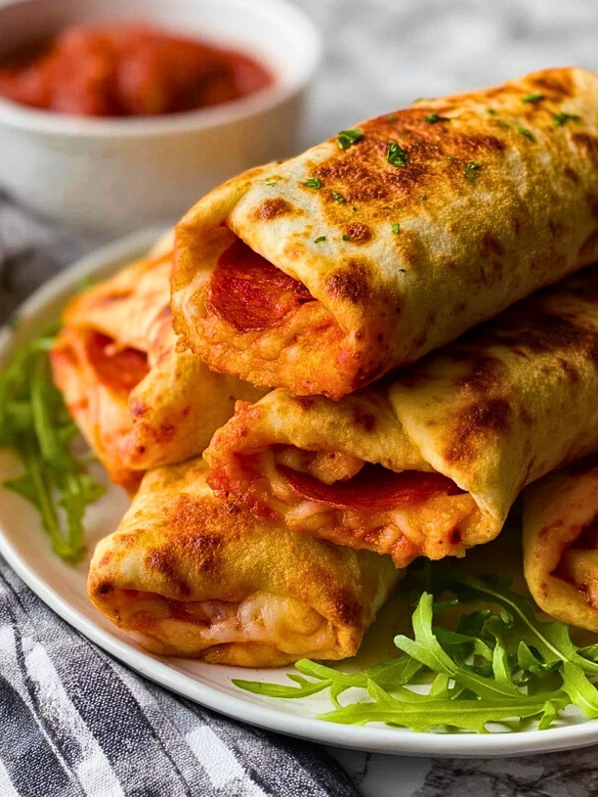 Lasse die Pizza-Burritos kurz abkühlen, serviere sie dann am besten mit einer Schale Marinara-Soße oder einem frischen Kräuterdip.