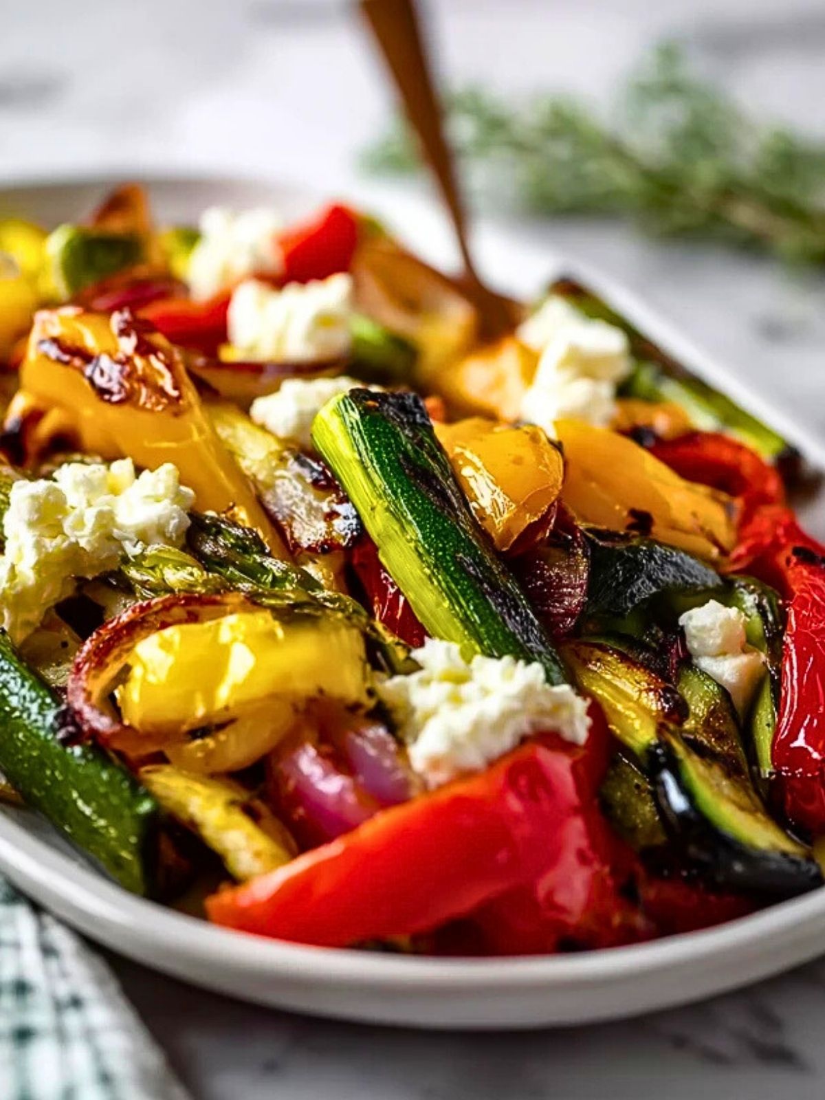 Dieses schnelle Ofengericht kombiniert aromatisch geröstete Paprika, Zucchini, grünen Spargel und rote Zwiebeln mit cremigem Ziegenkäse. Perfekt als leichtes Hauptgericht oder als Beilage – unkompliziert, vegetarisch und voller Geschmack.