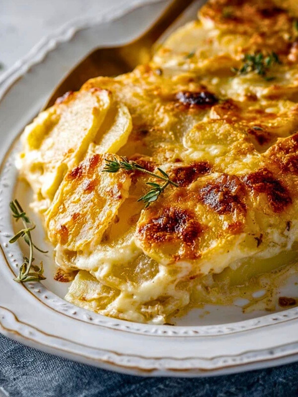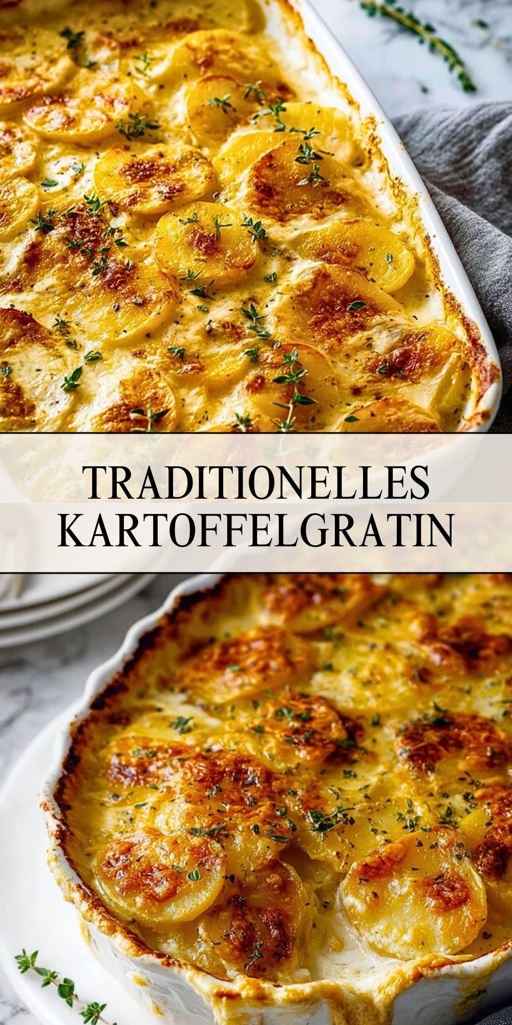 Cremiges, goldgelb überbackenes Kartoffelgratin nach traditionellem Rezept: Dünne Kartoffelscheiben, aromatische Sahne-Milch, würziger Knoblauch und eine unwiderstehliche Kruste – perfekt als Beilage oder vegetarisches Hauptgericht.
