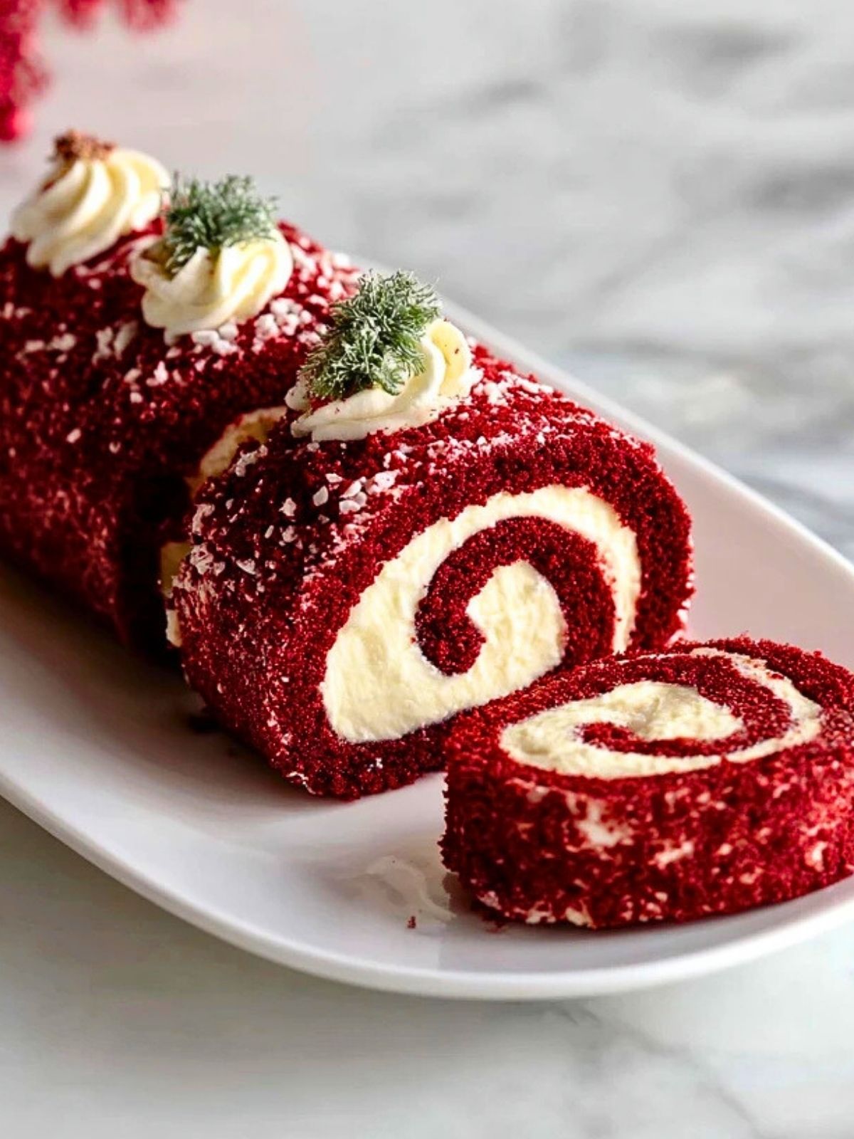 Diese Weihnachtliche Rote Samtrolle kombiniert einen lockeren, saftigen Red-Velvet-Biskuit mit einer cremigen Frischkäsefüllung. Perfekt für die Adventszeit und festliche Anlässe.